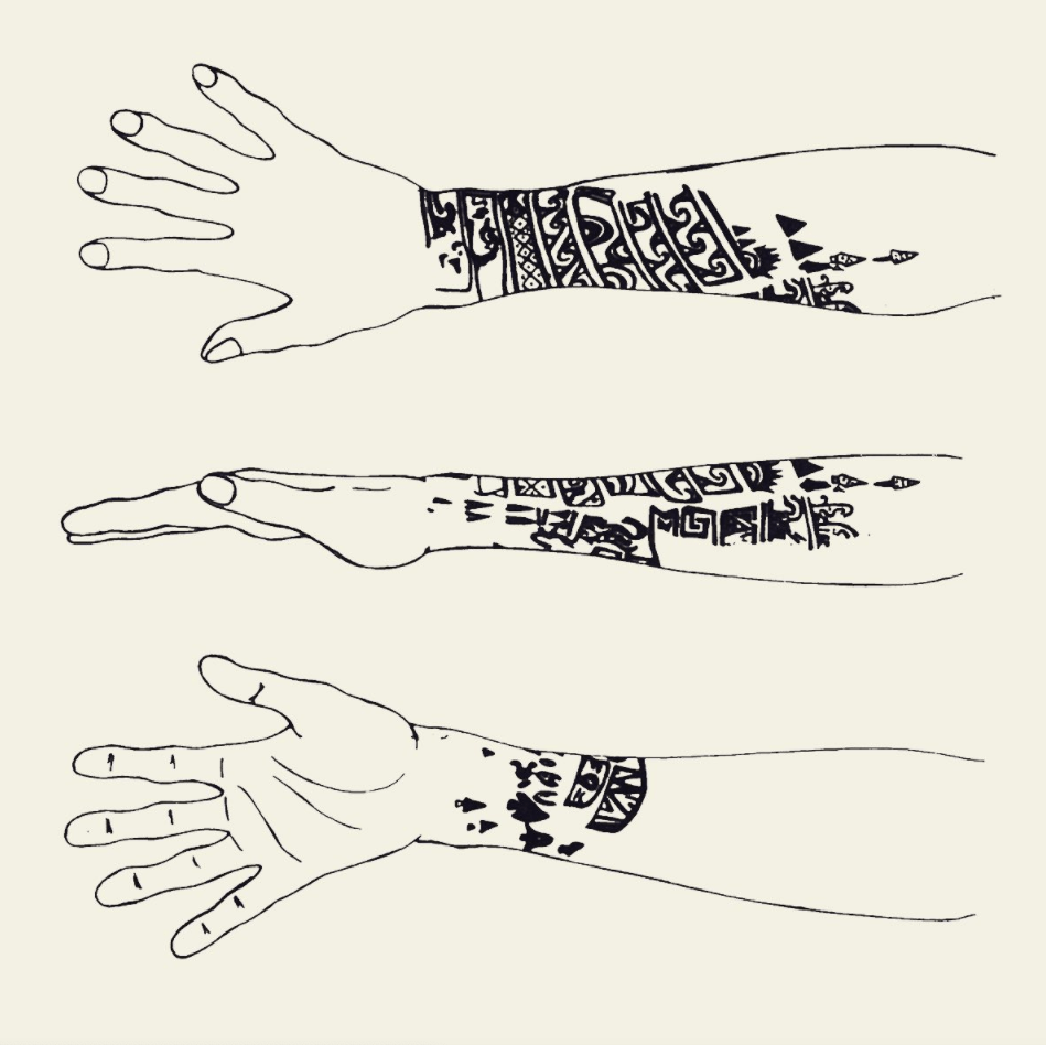Tattooed Chimu mummies have been identified in several locations in Peru. This drawing shows marks on the right forearm of an adult mummy of unknown sex from the Ancash region, dated around 1350 CE. The bands of geometric motifs undoubtedly had symbolic value to the individual who wore them, but those specific meanings – and what if any physical objects or beings they represent – are elusive. Easier to identify are the several arrow or harpoon points, all oriented towards the elbow.