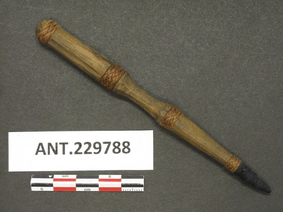 This in-line tattoo tool from Banaue, Mountain Province, Philippines has a carved wood shaft and is decorated with four circlets of plaited rattan. Two metal points are bound to the tip using blue yarn. It likely was made by the Ifugao people, among whom tattooing is called “bátok.” No date is noted on the collection record.